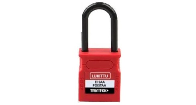 Punainen turvalukkolukko, jossa nailonsanka. Runko eristetty muovilla, sanka johtamaton nailon. Sangan sisämitat 36 x 20mm, sangan halkaisija 6mm. Metallirunko, muovieristetty. Lukossa turvalukittu merkintä sekä asettaja / puhelinnumero tila. 1 avain.