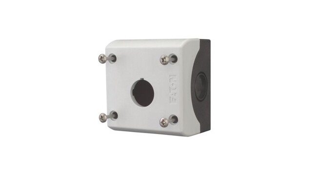 1-aukkoinen kotelo EATON, asennusreikä 22mm. Harmaa kansi. Mitat 72 x 56 x 80mm. Kotelointi IP67. M20 läpivientiaihiot sivuissa esim. holkkitiivisteelle.