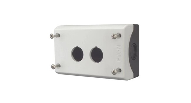 2-aukkoinen kotelo EATON, asennusreikä 22mm. Harmaa kansi. Mitat 120 x 56 x 80mm. Kotelointi IP67. M20 läpivientiaihiot sivuissa esim. holkkitiivisteelle.