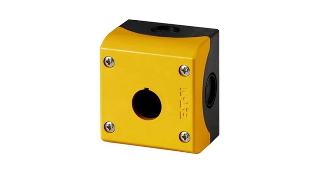 1-aukkoinen kotelo EATON, asennusreikä 22mm. Keltainen kansi. Mitat 80 x 56 x72mm. Kotelointi IP67.