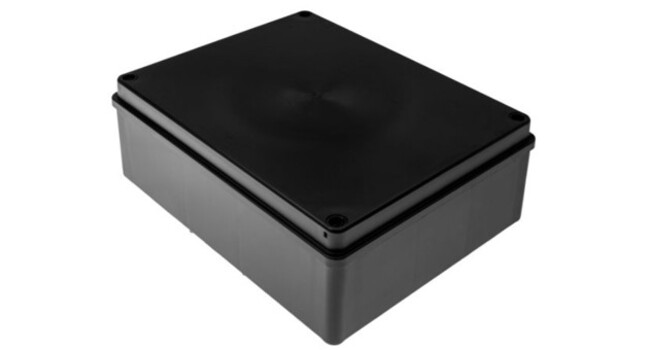 Halogeenivapaa kytkentäkotelo pinta-asennukseen. Sileät sivut, mitat 240x190x90mm. Väri: Musta (RAL 9006). Kotelointi IP65, UV kestävä.