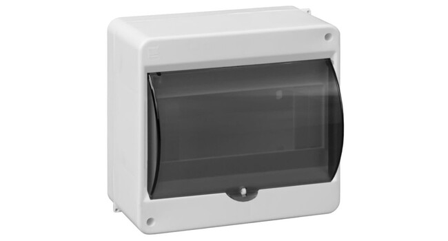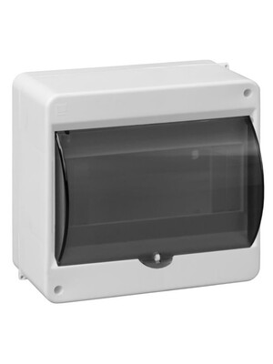 Pinta-asennettava modulikotelo 8-mod, jossa musta, läpinäkyvä kansi. Kotelonti IP40, In 63A. Iskunkestävä kotelo IK08. Kansi aukeaa ylöspäin. Mitat 165 x 140 x 83mm. Väri: Harmaa (RAL 9010).