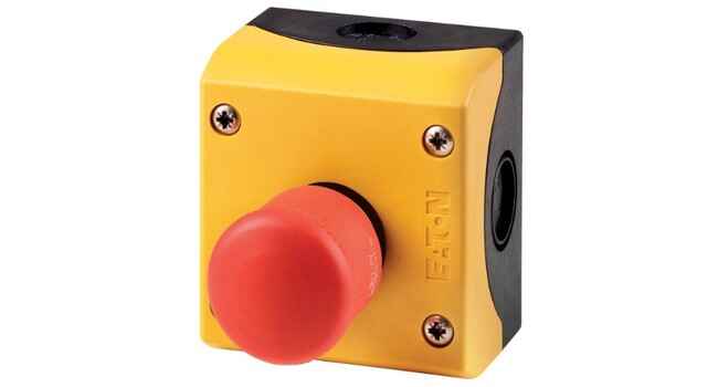 Laadukas koteloitu EATON Hätäseis -painike, jossa 2kpl avautuvia (NC) koskettimia. Sienipainike 38mm, kiertovapautus. Umax 500VAC / 220VDC. IP66.