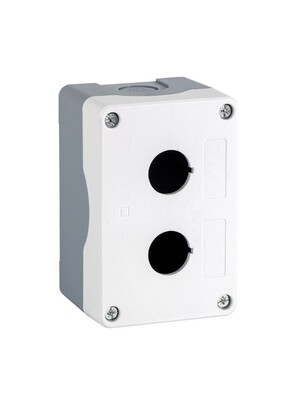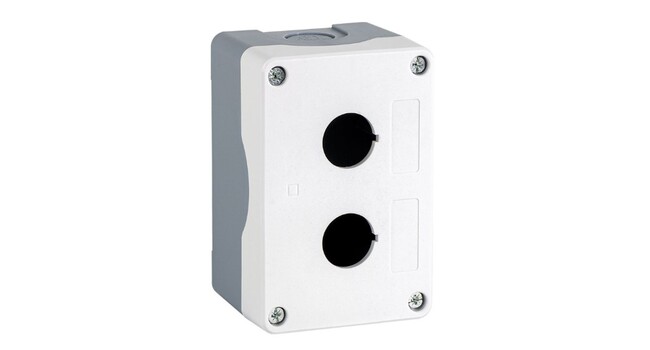 2-aukkoinen painikekotelo ELMARK painonapeille ja merkkivaloille. Kotelointi IP65. Mitat 111 x 73 x 60mm. Reikäaihio kaapeliläpivientiin holkkitiivisteelle PG13,5.