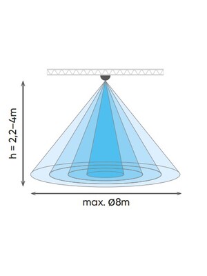 - Tunnistusalue 360°, Tunnistusalue 8m (kun asennuskorkeus > 2,2m)