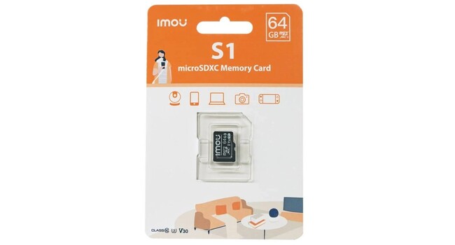 64GB Mikro SC muistikortti IMOU S1, joka sopii käytettäväksi IMOU valvontakameroissa, älypuhelimissa ym. Lukunopeus 95MB/s ja kirjoitusnopeus 38MB/s.