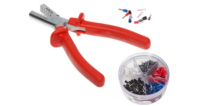 Pääteholkkipihdit eristetyille ja eristämättömille pääteholkeille. Soveltuu pääteholkeille 0,25 - 2,5mm². Nopeakäyttöiset puristuspihdit. Mukana tulee lisäksi eristetyt pääteholkit 400kpl. Katso alta lisätiedot.
