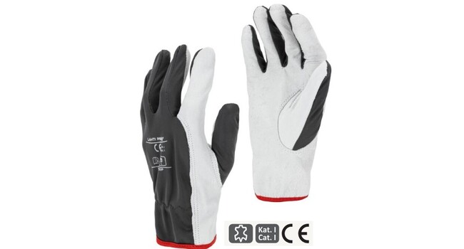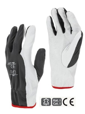 Työhanska, materiaali: vuohennahka, polyesteri. Kämmen nahkaa, mikä takaa pitkän kestävyyden. Joustava kiristysnauha ranteessa. EN, ISO 21420. Koko 11 (XXL).